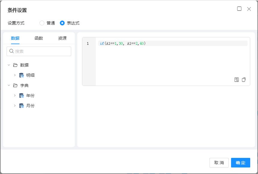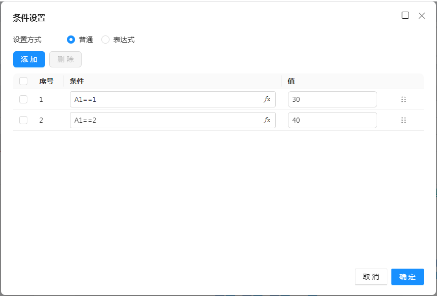 宽度、最大宽度属性设置类似,以隐藏为例,例如:判断A1单元格值为1时,当前单元格所在列宽度为30,当为2时,则列宽度为40。条件配置如下图: