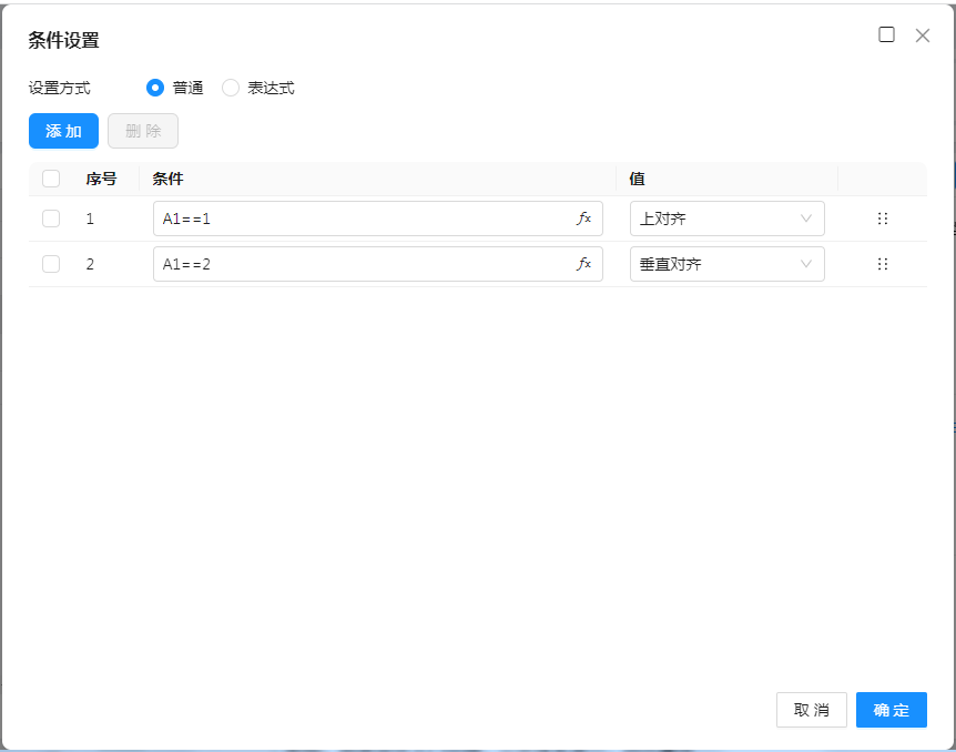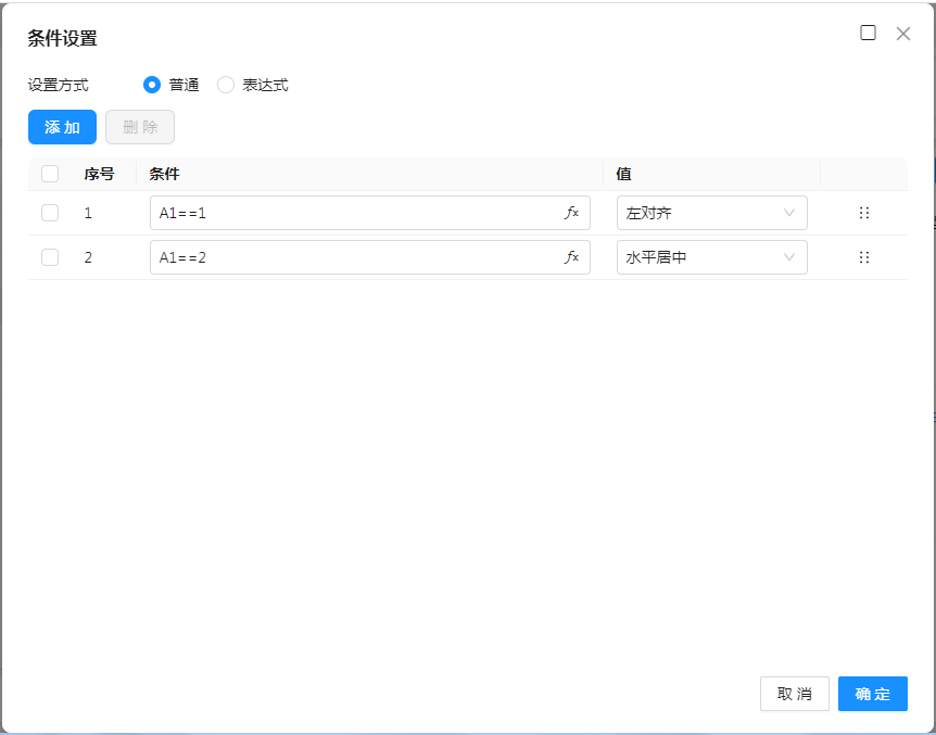 设置条件表达式来显示当前单元格的水平对齐格式。例如:判断A1单元格值为1时,当前单元格左对齐,当为2时,则为水平居中。条件配置如下图:
