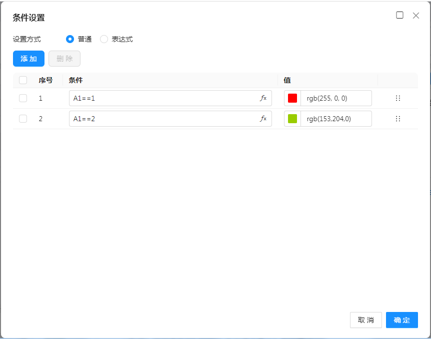 设置条件表达式来显示当前单元格的字体颜色。例如判断A1单元格值为1时,当前单元格字体颜色为红色,当为2时,则为绿色。条件配置如下图: