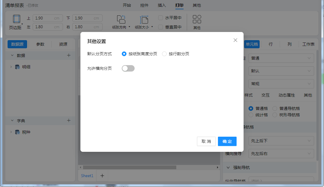 横向分页是在报表宽度超过页面的宽度时的特性,开启后支持“横向分页打印方向”:先列后行、先行后列。