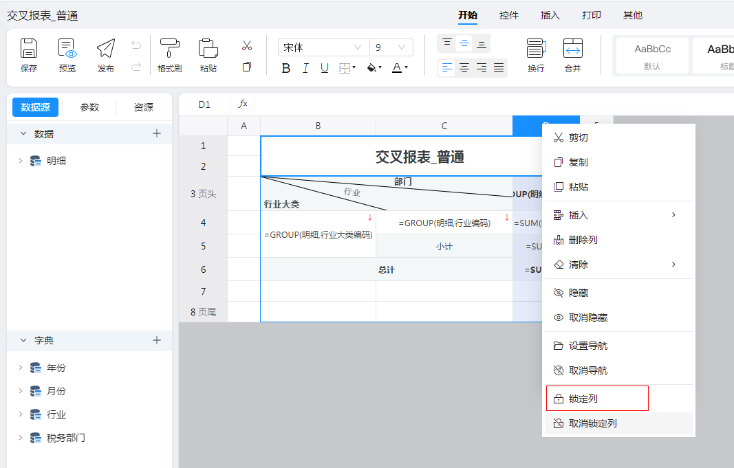 这样可以实现【行业大类】、【行业】在每页中都能显示,这样可以方便和【部门数据】进行查看。