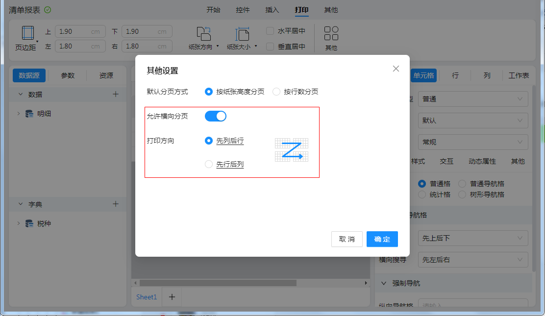 打开工具栏:【打印】-》【其他】窗口,开启“允许横向分页”即可: