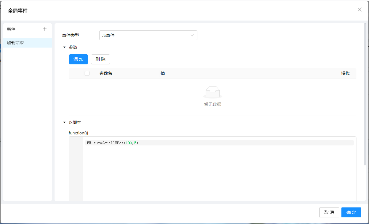 该示例选择“加载结束”,事件类型选择“JS事件”,并配置实现跑马灯效果的JS脚本,如下图: