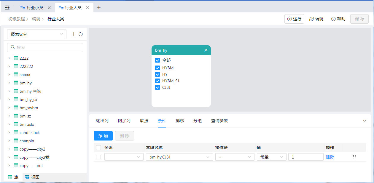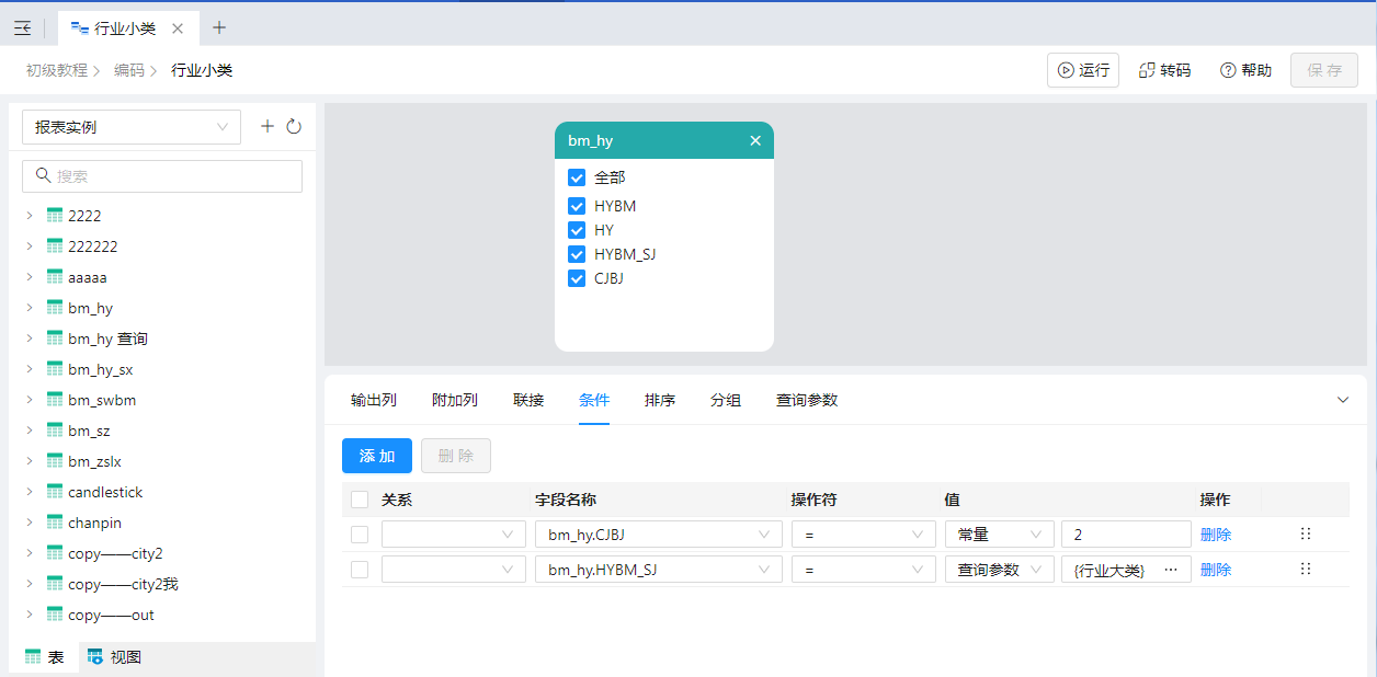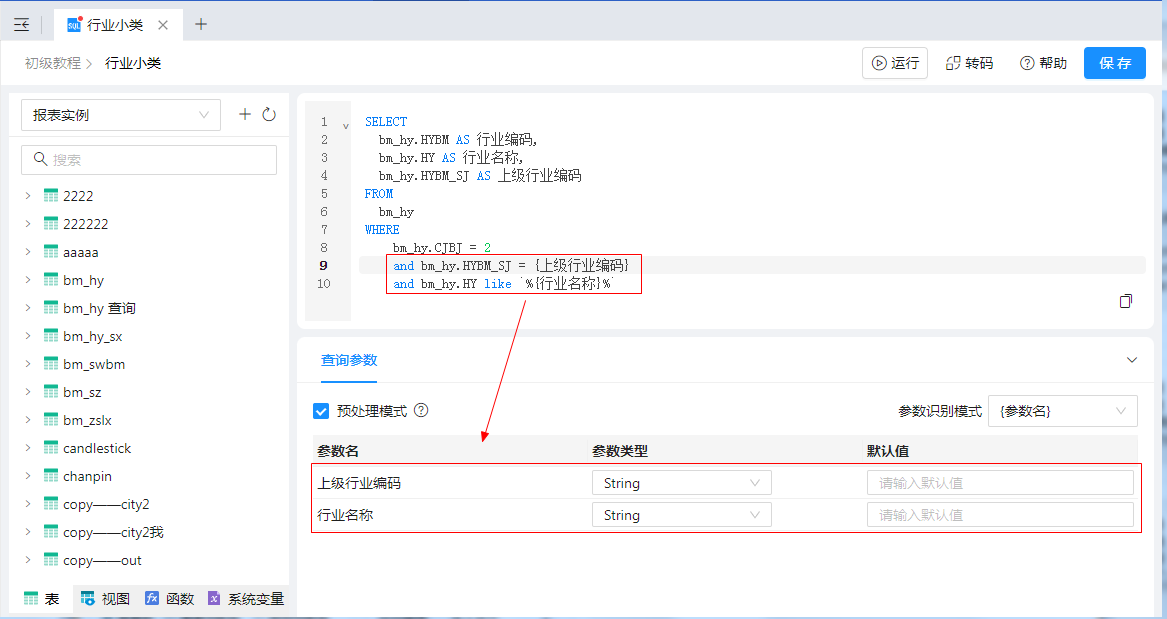 双击“行业小类”数据源,“上级行业编码”参数值选择参数“行业大类”即可,设置如下图: