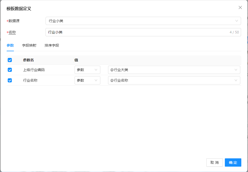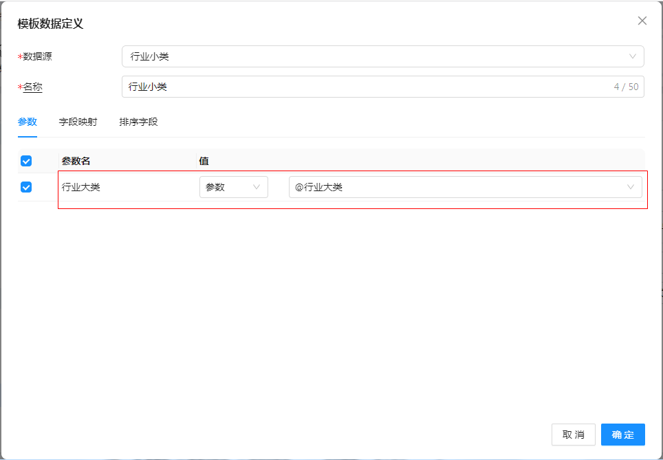 刚才提到了参数数据源中定义的预设参数要接收报表参数值,那么就需要将数据视图参数与报表参数进行映射,即:将“上级行业编码”的值需要接收“行业大类”的参数值。