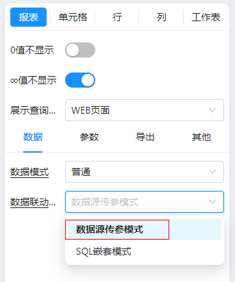 很重要的一个操作就是:将报表属性中的“数据联动模式”设置为“数据源传参模式”,如下图: