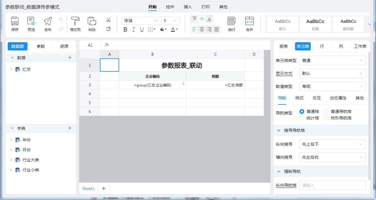 数据源传参模式的核心原理是被联动控件的取数范围是跟随该控件配置的模板数据所关联的报表参数自动进行变化的,联动关系系统会自动分析,无需用户手动配置联动关系。