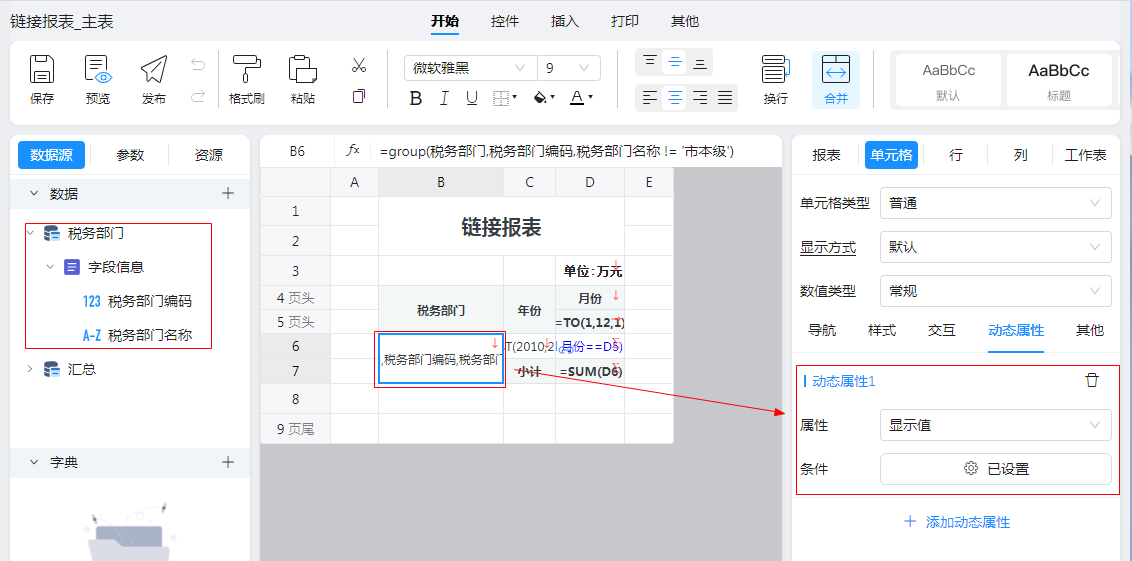 B6单元格是税务部门编号,但是显示的时候想按照税务部门名称进行显示,那该单元格的“显示值”需要使用动态属性进行设置,条件使用表达式“”税务部门.税务部门名称”即可。