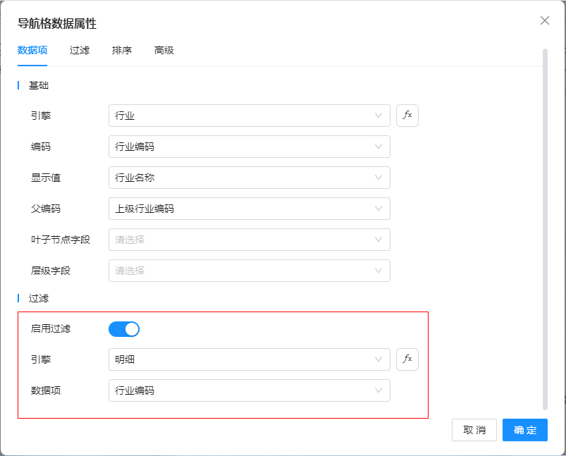 在“导航格数据属性”窗口中,选中“启用过滤”复选框,设置引擎为“明细”,数据项为“行业编码”,如下图: