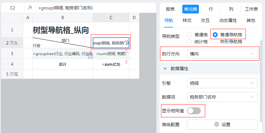 设置C2单元格为“普通导航格”,除了确保“显示相同值”不被打钩之外,要注意,D3的扩展方向是“横向”。