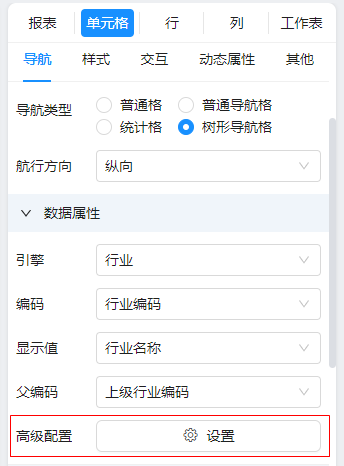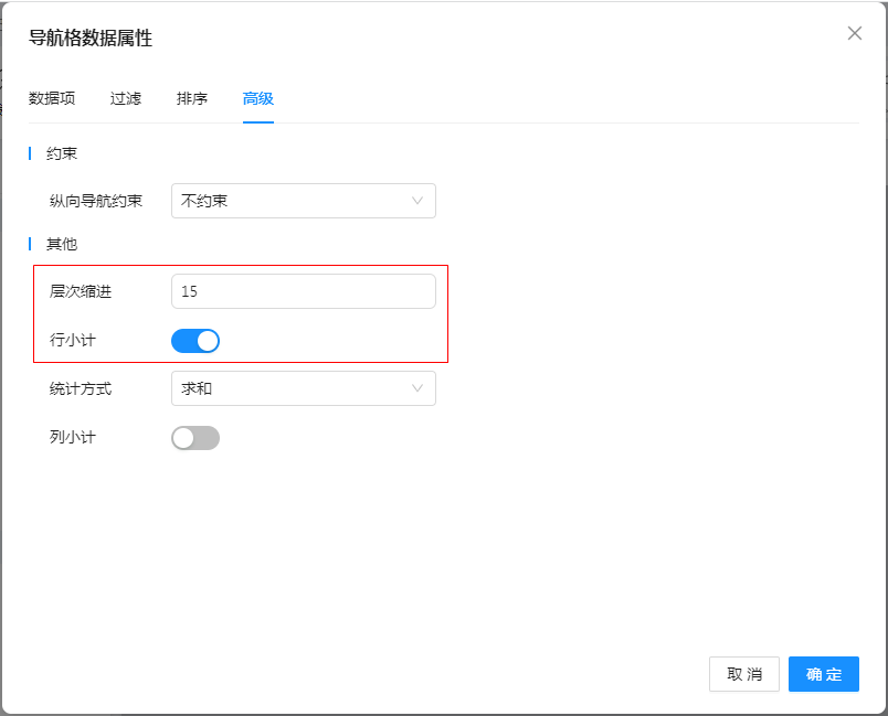 在“高级”中设置不同层级内容的偏移距离;勾选“行小计”,表示该导航树需要自动的行小计功能,如下图: