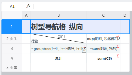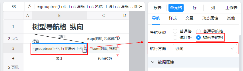 设置B3单元格为“树型导航格”,航行方向为“纵向”,如下图: