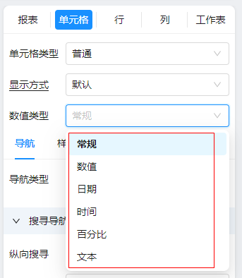 支持的格式包括:常规、数值、日期、时间、百分比、文本,如下图: