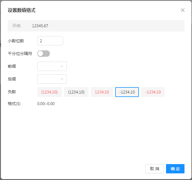 小数位数 设置数值需要保留几位小数,默认2位,遵循四舍五入规则
