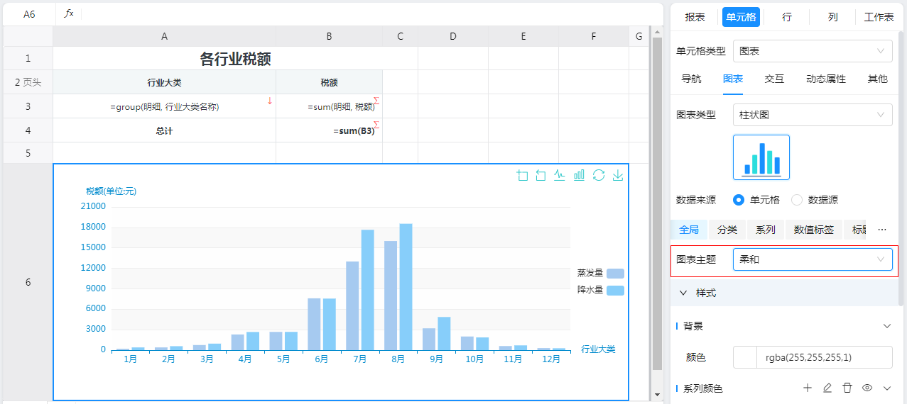 [图表主题]选择“柔和”,可以实时查看主题应用效果,如下图: