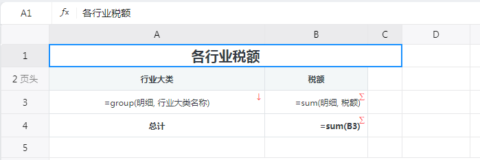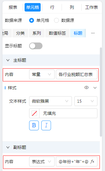 设置[主标题]为“各行业税额汇总表”,[副标题]为“=@年份+”年”+@月份+”月””,表示某年某月各行业的税额汇总。设置如下图: