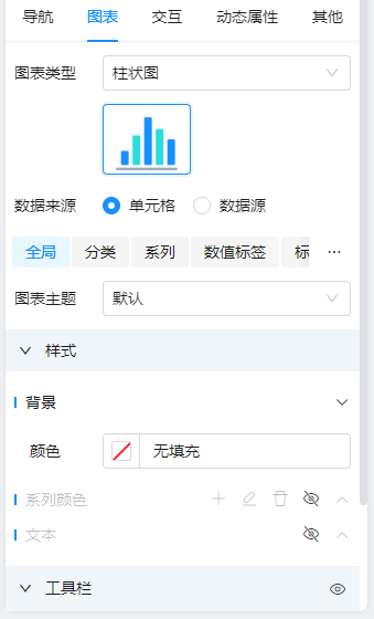 “柱状图”可设置图表的属性包括:数据来源、分类、系列、标题、X轴、Y轴、图例等。