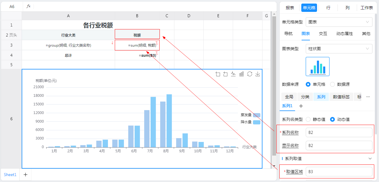 上方为各行业税额统计表,下方各行业税额柱状统计图。