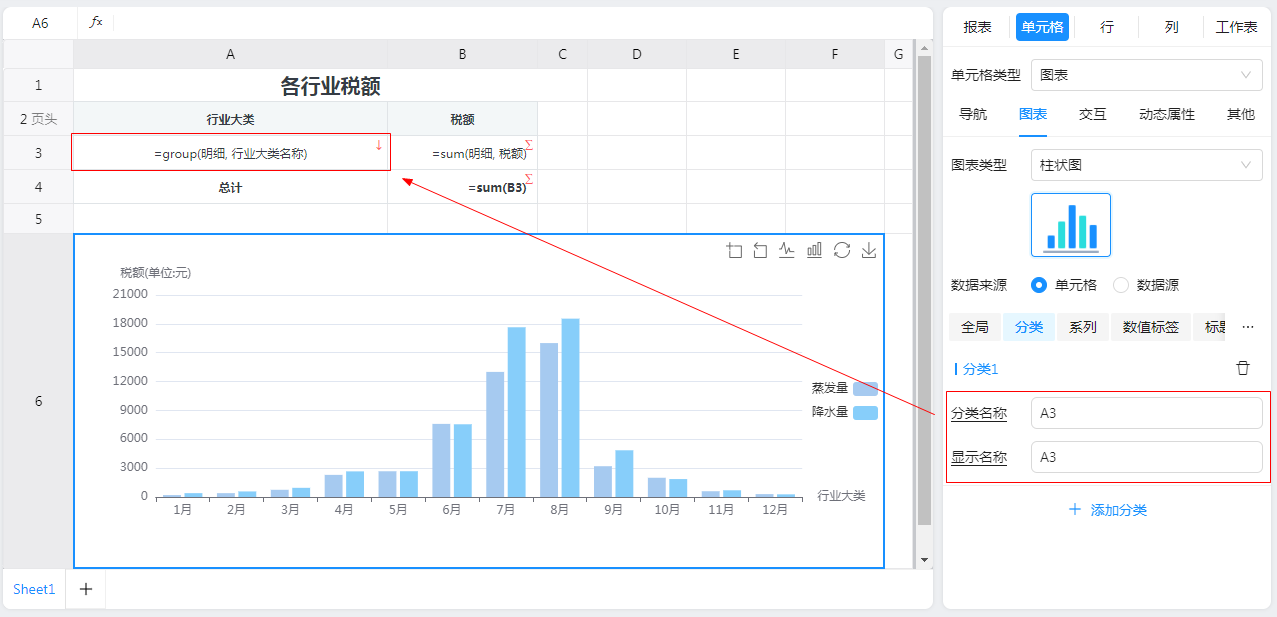 数据来源于单元格,[分类标题]和[分类名称]均输入单元格“A3”。设置如下图: