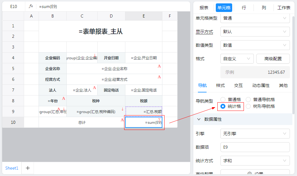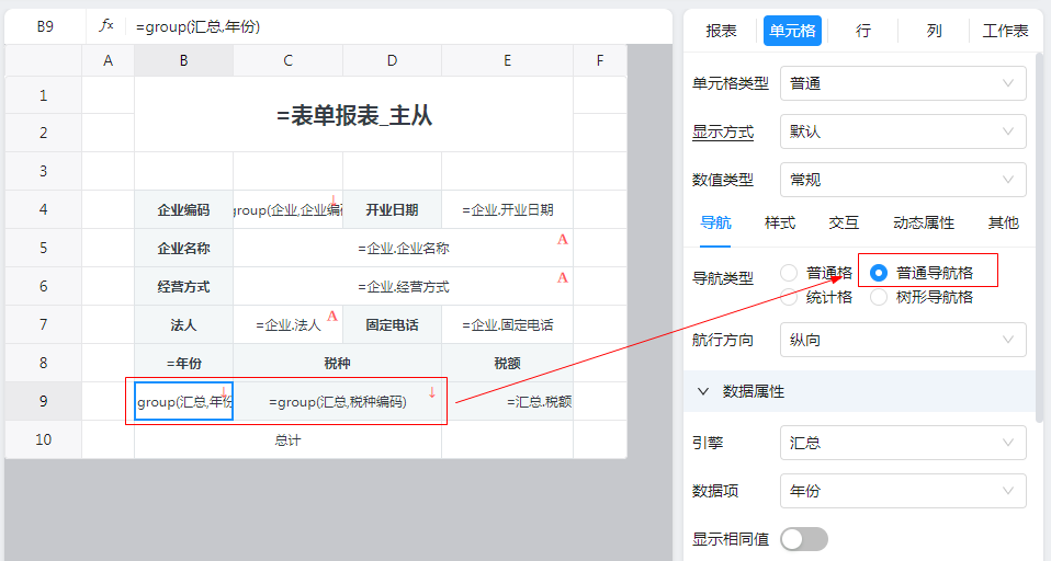 一个企业对应多条税额信息且是分组显示的,因此需要分别将从表信息中的 B9 和 C9 单元格类型设置为“普通导航格”,如下图:
