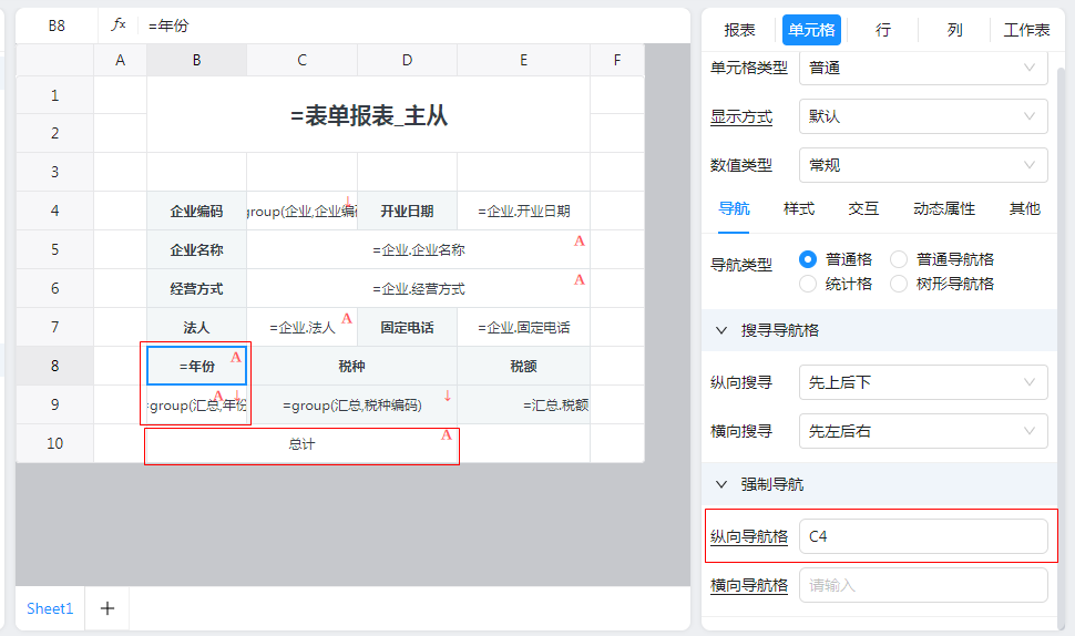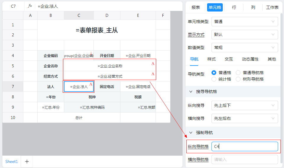 同样,从表信息要跟随主表导航格进行扩展,从表每行中的第一个单元格都需要设置强制导航(纵向导航格设置为:C4),如下图: