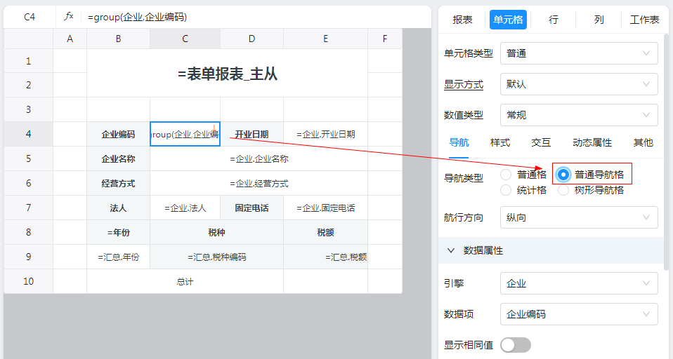 将主表信息中的 C4 单元格类型设置为“普通导航格”,如下图: