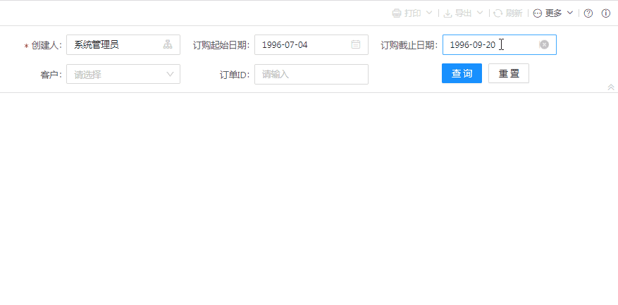 以“订单”为例,限制参数“订购截止日期”的值不能小于“订购起始日期”,选择的值不符合规则时将报错,如下图: