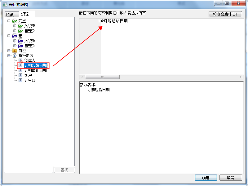 其中,右边值,可以通过“…”进入表达式界面,选择[资源>模板参数]中的“订购起始日期”参数,如下图: