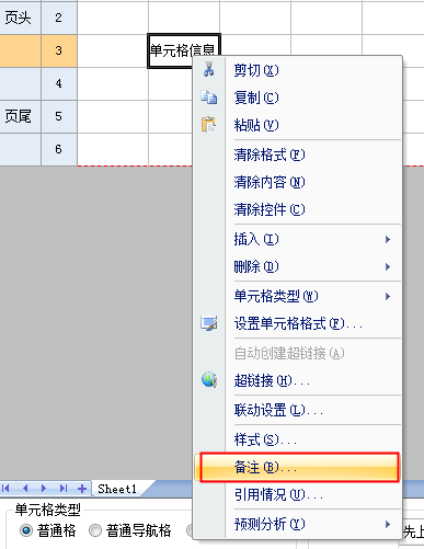新建报表,选中某单元格输入内容“单元格信息”,右键选择菜单项[备注],如下图: