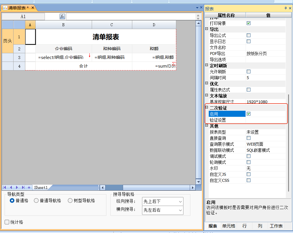 打开需要设置二次验证的模板文件(报表或单元格表单),在右侧“报表属性”面板中,找到“二次验证”属性分组。