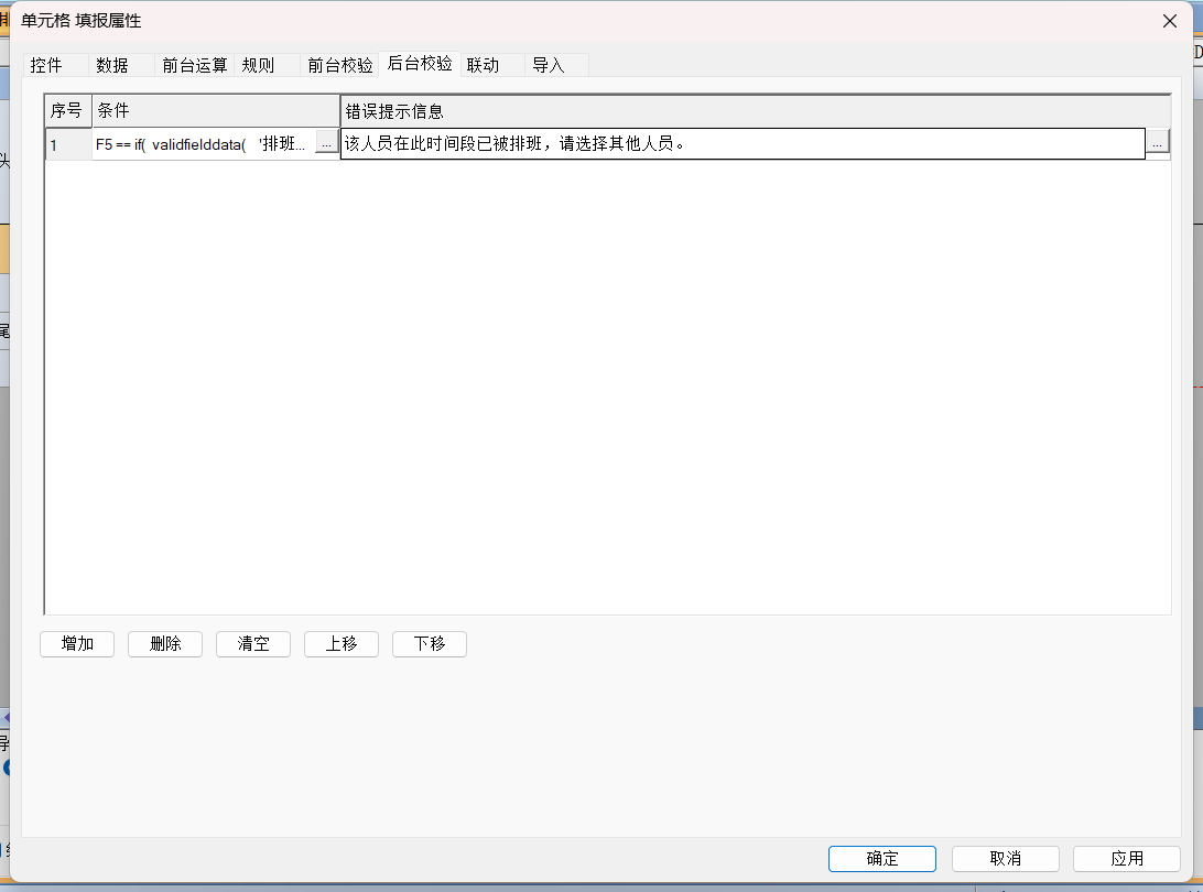 )3、在「错误提示信息」列输入:该人员在此时间段已被排班,请选择其他人员。