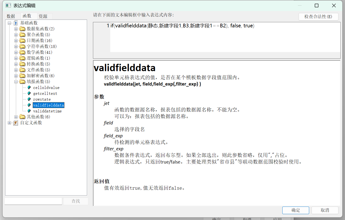 该函数的基本语法:validfielddata(数据集名称, 校验字段, 筛选条件)
