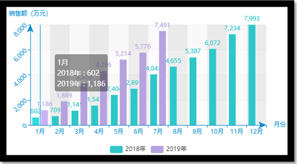 (7)标题:主标题内容:“=YEAR()+’年两年累计销售额’”;